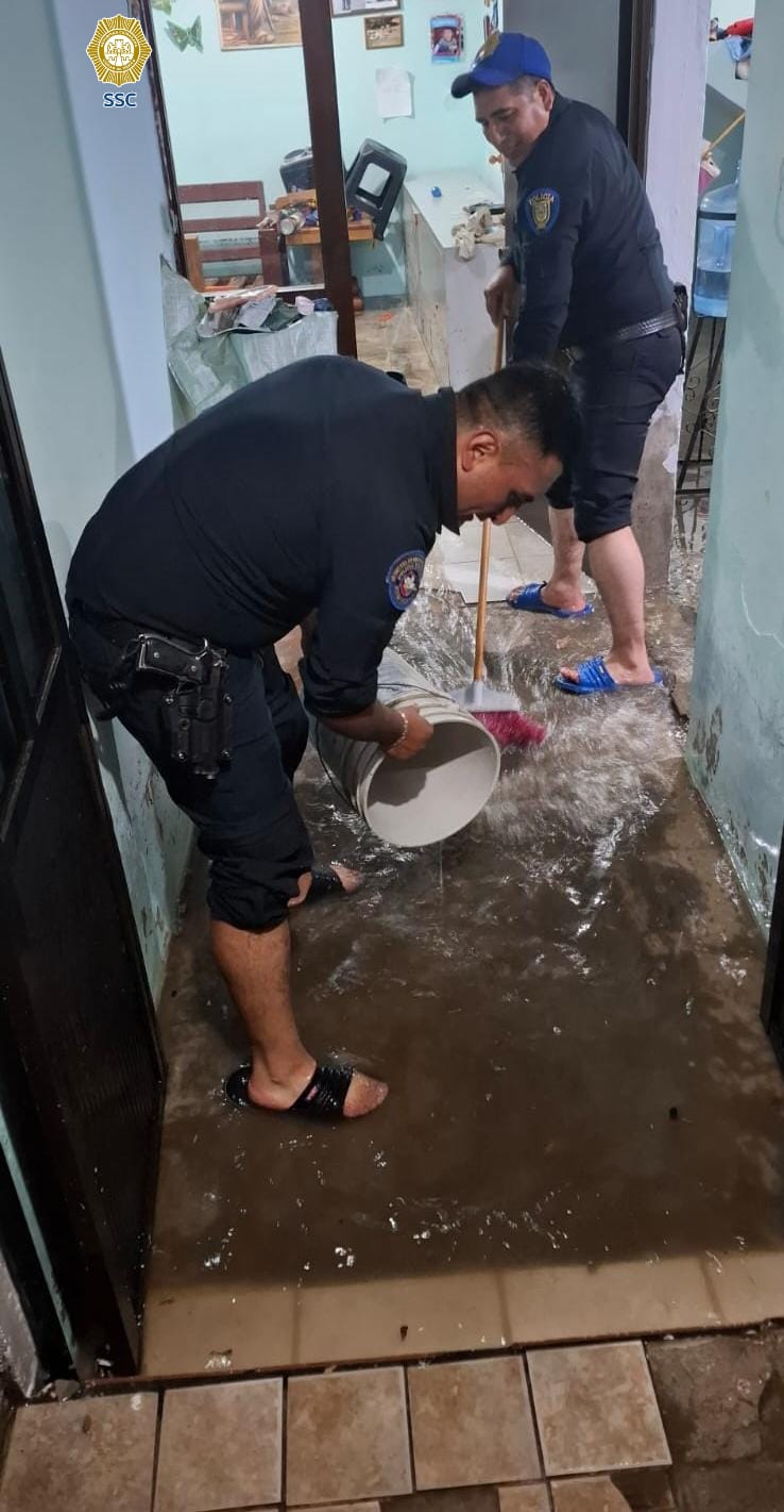 Policías de todos los sectores mantienen diversas acciones en beneficio de residentes y población flotante de las colonias afectadas por las intensas lluvias que se suscitaron durante la tarde de ayer lunes y parte de la madrugada de hoy martes.