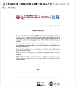 El Servicio de Transportes Eléctricos a través de la Secretaría de Movilidad (SEMOVI) se pronunció respecto al suceso mencionando que el accidente fue ocasionado por el choque de la unidad de Trolebús con el poste de la vía. Además informó que el incidente dejó 20 personas lesionadas las cuales inmediatamente fueron llevadas a centros médicos para su debida evaluación.