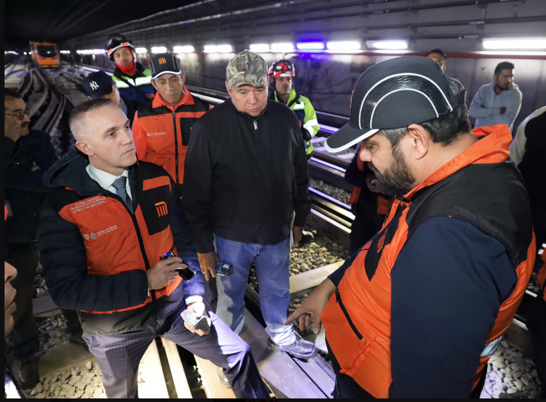 El director del Metro, Adrian Rubalcava y su equipo más cercano hizo un recorrido de supervisión de los trabajos de mantenimiento de las vías en la estación Zaragoza.