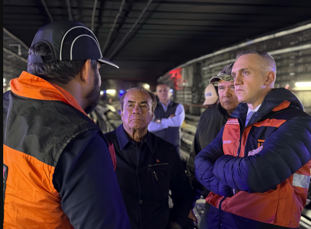 El director del Metro, Adrian Rubalcava y su equipo más cercano hizo un recorrido de supervisión de los trabajos de mantenimiento de las vías en la estación Zaragoza.
