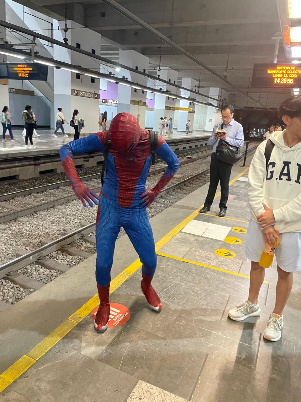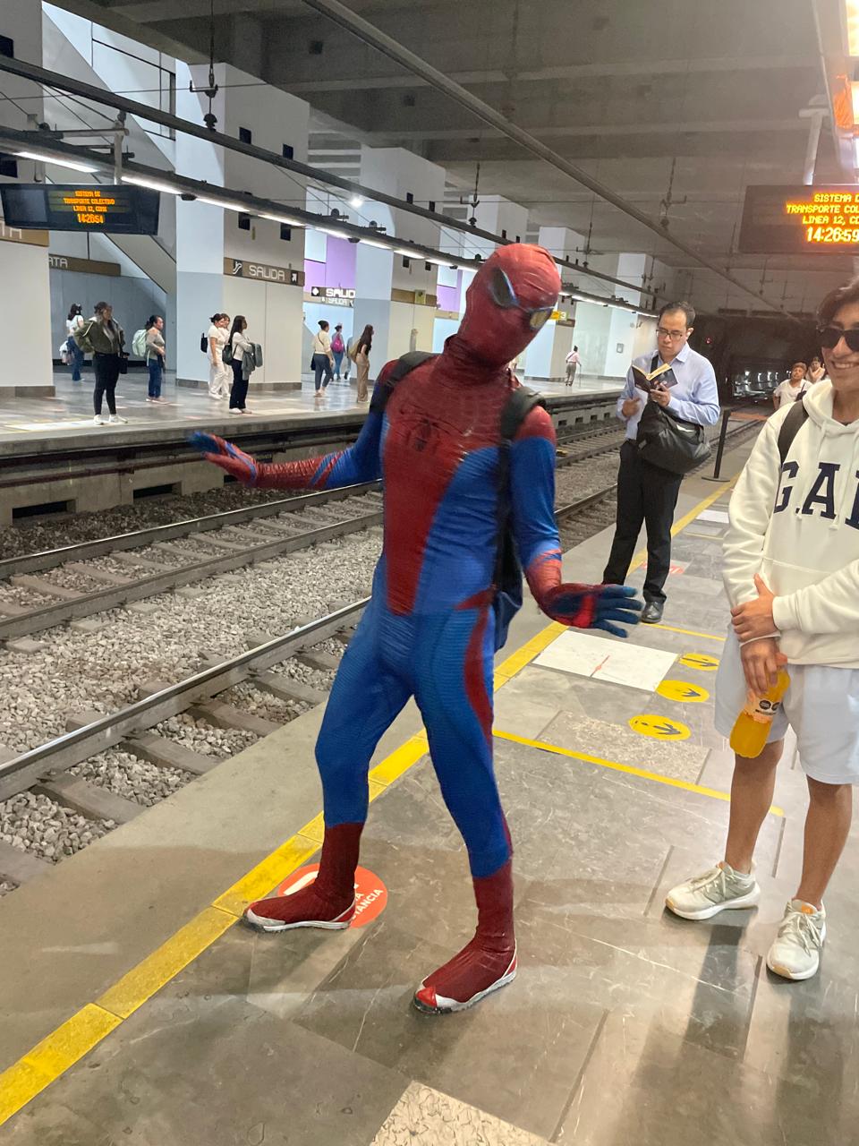 El inusual suceso ocurrió en la Línea 12, que recorre de Mixcoac a Tláhuac. En las imágenes captadas por otro usuario se ve al joven, con el icónico traje azul y rojo, en espera del vagón y al verse sorprendido no dudó en posar para la foto.