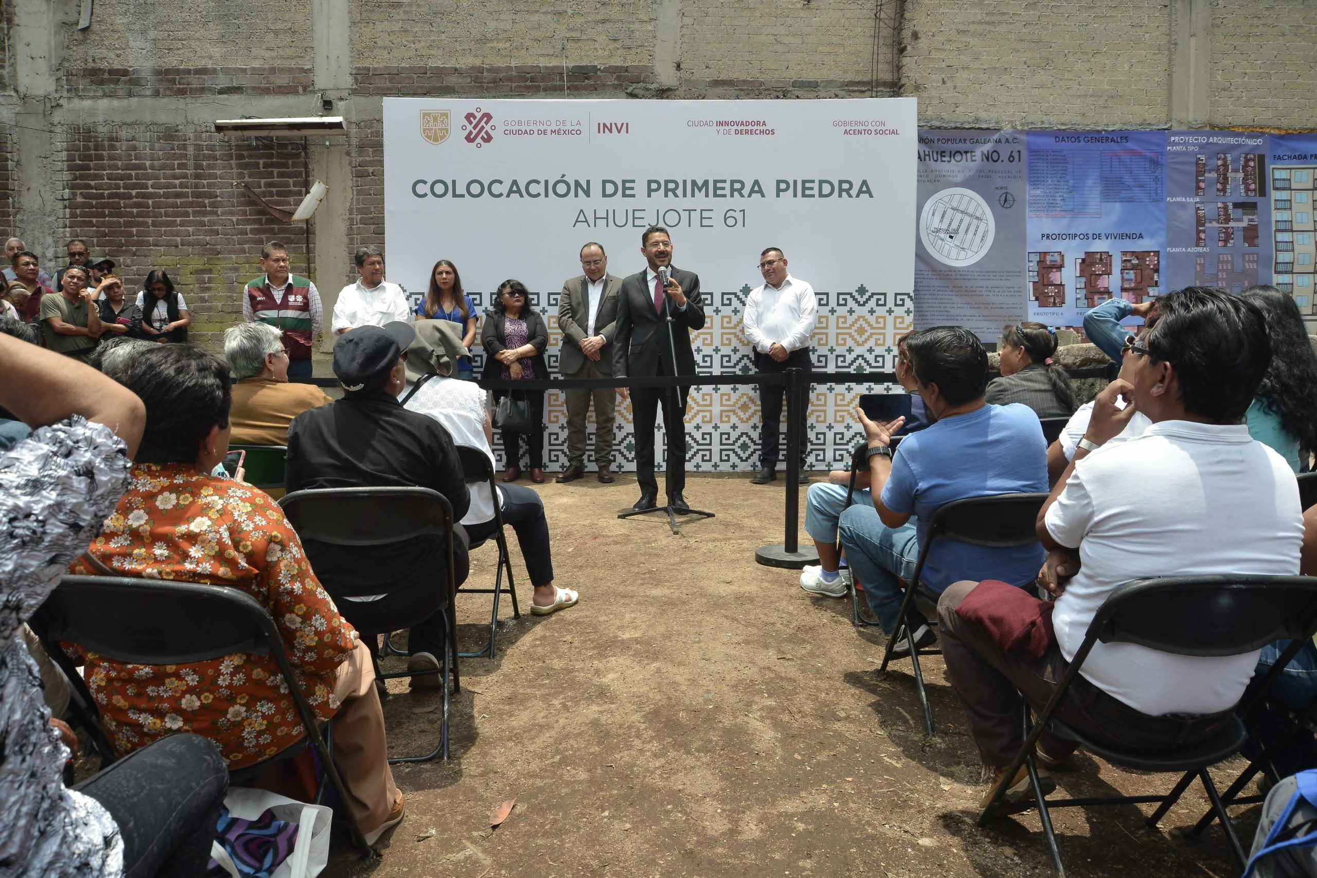 El Jefe de Gobierno, Martí Batres Guadarrama, colocó la primera piedra de la que será la Unidad Habitacional “Ahuejote 61”, ubicada en la colonia Pedregal de Santo Domingo, Alcaldía Coyoacán, que será construida por el Instituto de Vivienda de la Ciudad de México (INVI) y beneficiará a 37 familias quienes contarán con un hogar digno y sustentable.