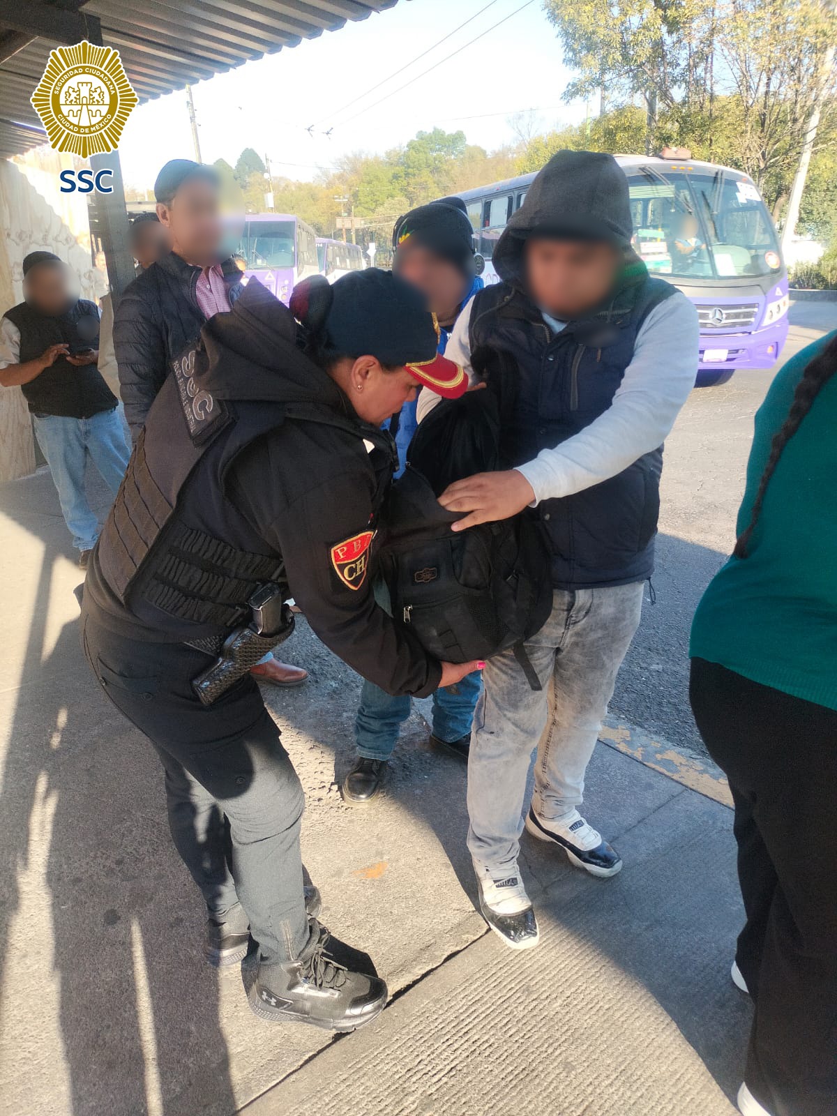 Elementos de la Secretaría de Seguridad Pública realizan revisiones a pasajeros en centros de transferencia y paraderos a fin de prevenir la delincuencia y generar una movilidad segura en el transporte público.
