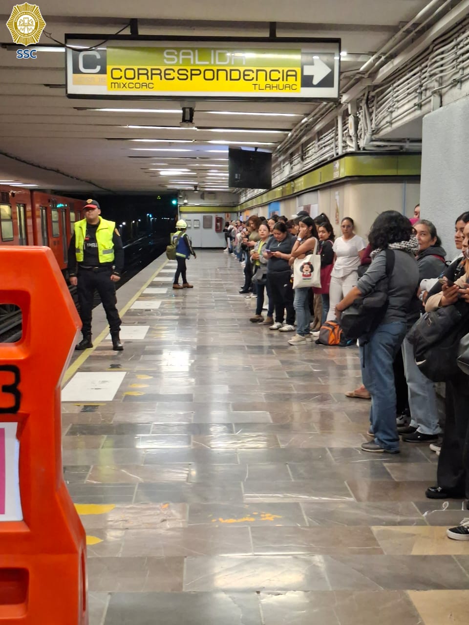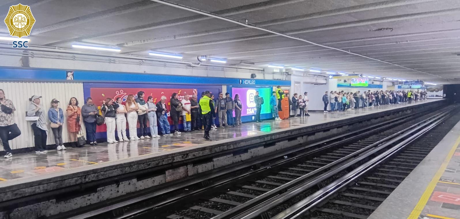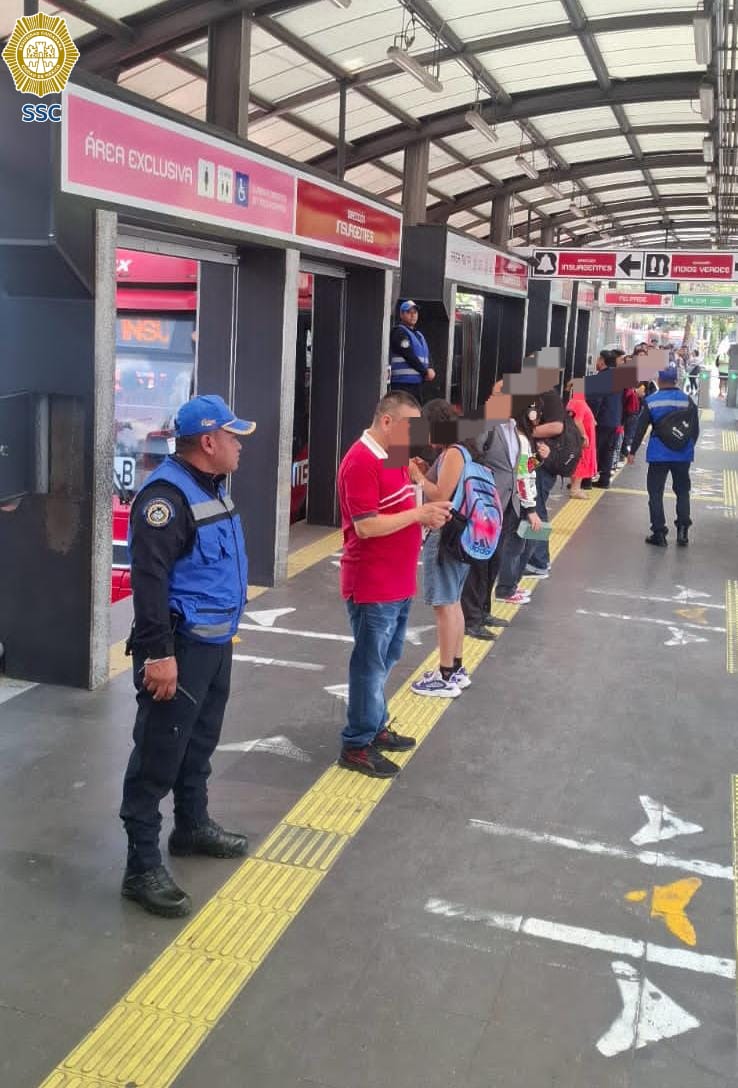 Como parte del Segundo Simulacro Nacional 2025, oficiales de la Policía Bancaria e Industrial (PBI) y de la Policía Auxiliar de la SSC brindan orientación a las personas usuarias del Sistema de Transporte Colectivo (STC) Metro y Metrobús, a fin de que realicen el repliegue de seguridad al interior de las instalaciones.