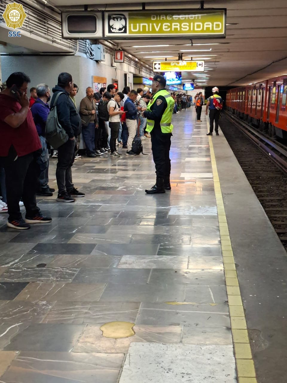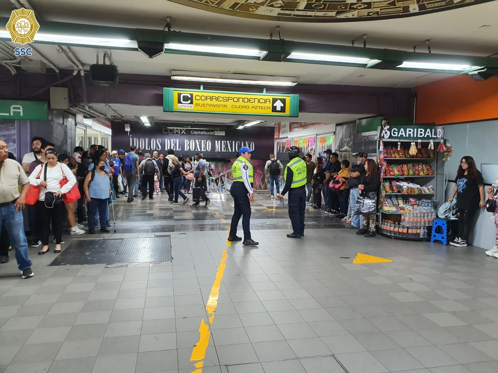Como parte del Segundo Simulacro Nacional 2025, oficiales de la Policía Bancaria e Industrial (PBI) y de la Policía Auxiliar de la SSC brindan orientación a las personas usuarias del Sistema de Transporte Colectivo (STC) Metro y Metrobús, a fin de que realicen el repliegue de seguridad al interior de las instalaciones.