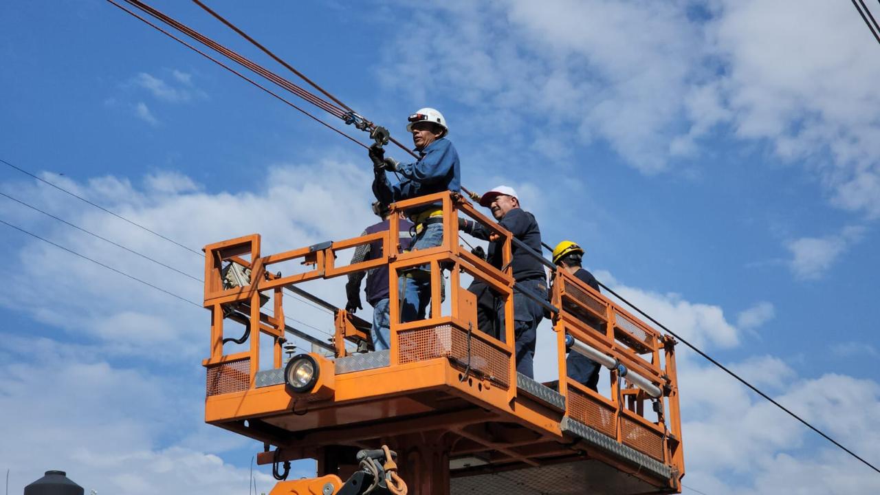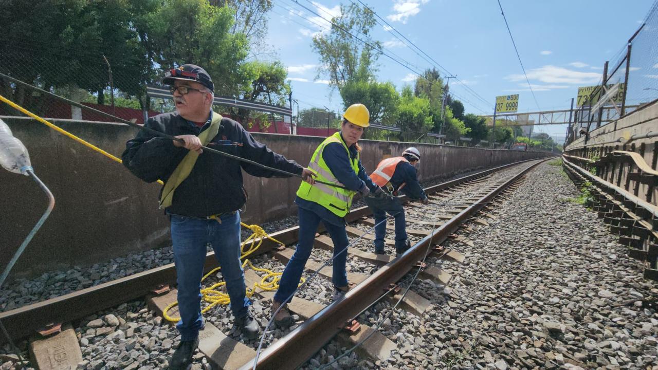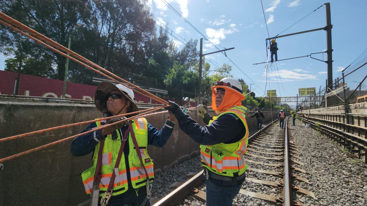 Técnicos en Instalaciones Fijas del STC M laboran desde la noche de ayer en la interestación Los Reyes-La Paz, sitio en el que se registraron afectaciones a la catenaria en la que corre la electricidad para la tracción de los trenes.