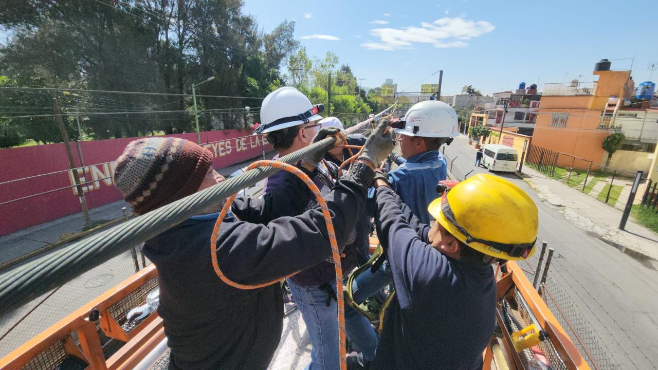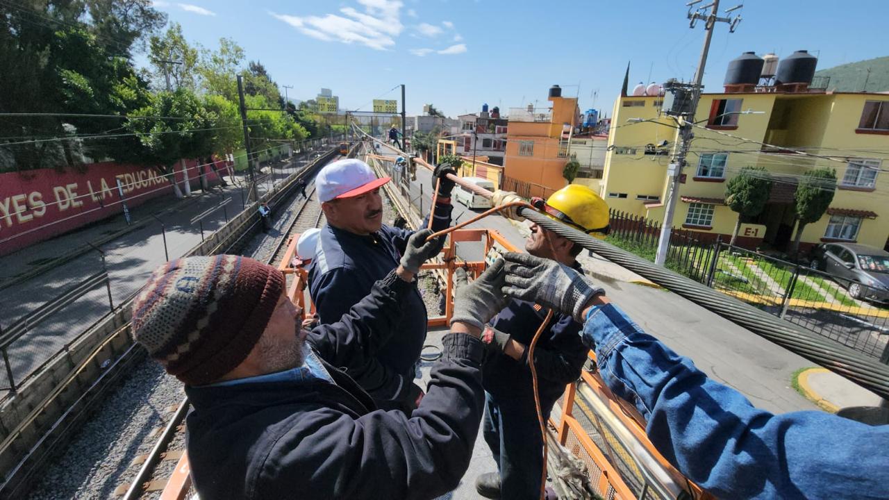 Técnicos en Instalaciones Fijas del STC M laboran desde la noche de ayer en la interestación Los Reyes-La Paz, sitio en el que se registraron afectaciones a la catenaria en la que corre la electricidad para la tracción de los trenes.